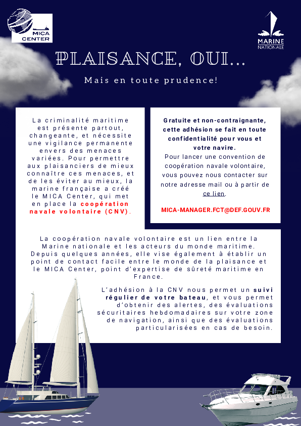 Pour permettre aux plaisanciers de mieux connaître ces menaces et les éviter au mieux, la marine française a créé le MICA Center, qui met en place la coopération navale volontaire (CNV).